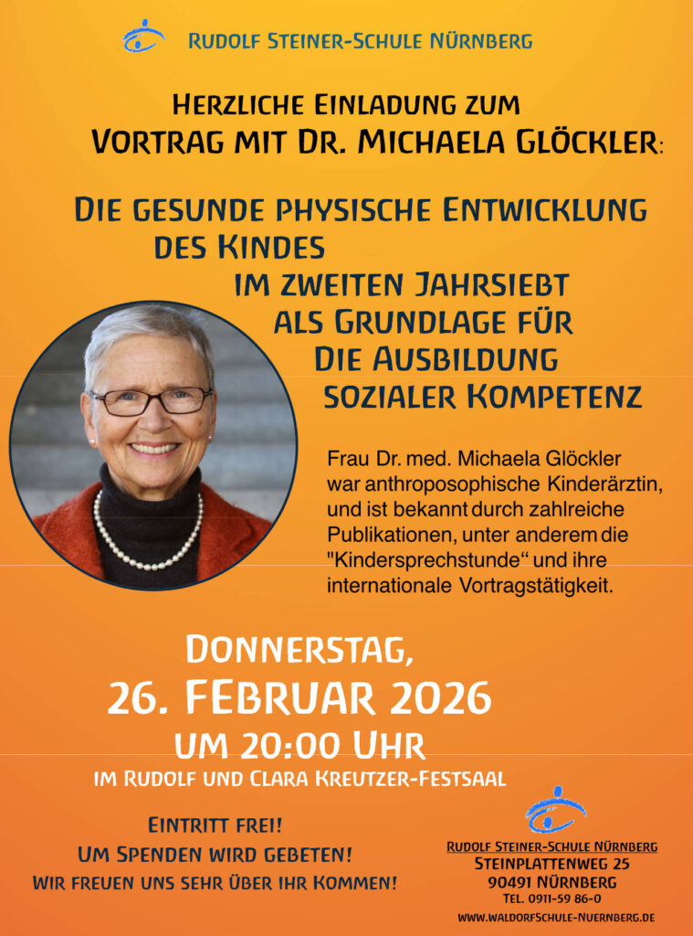 Frau Glöckler wird zum Thema “Die gesunde physische Entwicklung des Kindes im zweiten Jahrsiebt als Grundlage für die Ausbildung sozialer Kompetenz” sprechen.