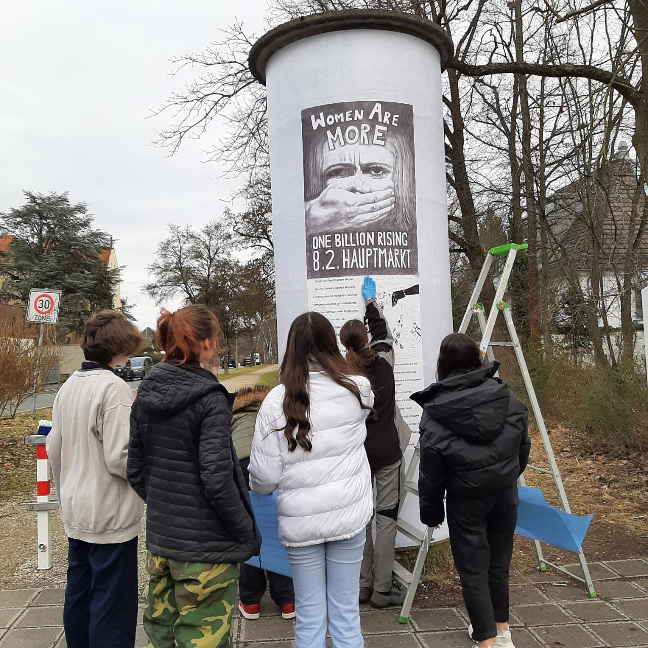 In einem Projekt zur Unterstützung der internationalen Kampagne „One Billion Rising“ gestalteten Schüler*innen der zehnten und elften Klassen eine Litfasssäule. Ihr Ziel war es, Bewusstsein für das Thema Gewalt an Frauen zu schaffen und für die Gleichstellung von Frau und Mann zu kämpfen.